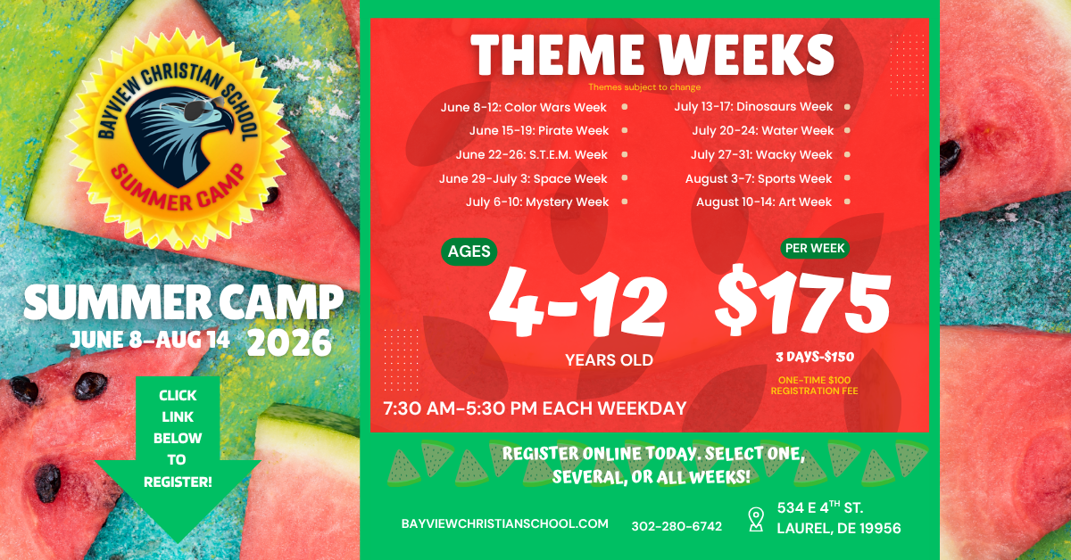 Bayview Christian School’s summer camp program is for 4 year olds through those who have recently finished 5th grade (12). The program is available from 7:30 am-5:30 pm each day.